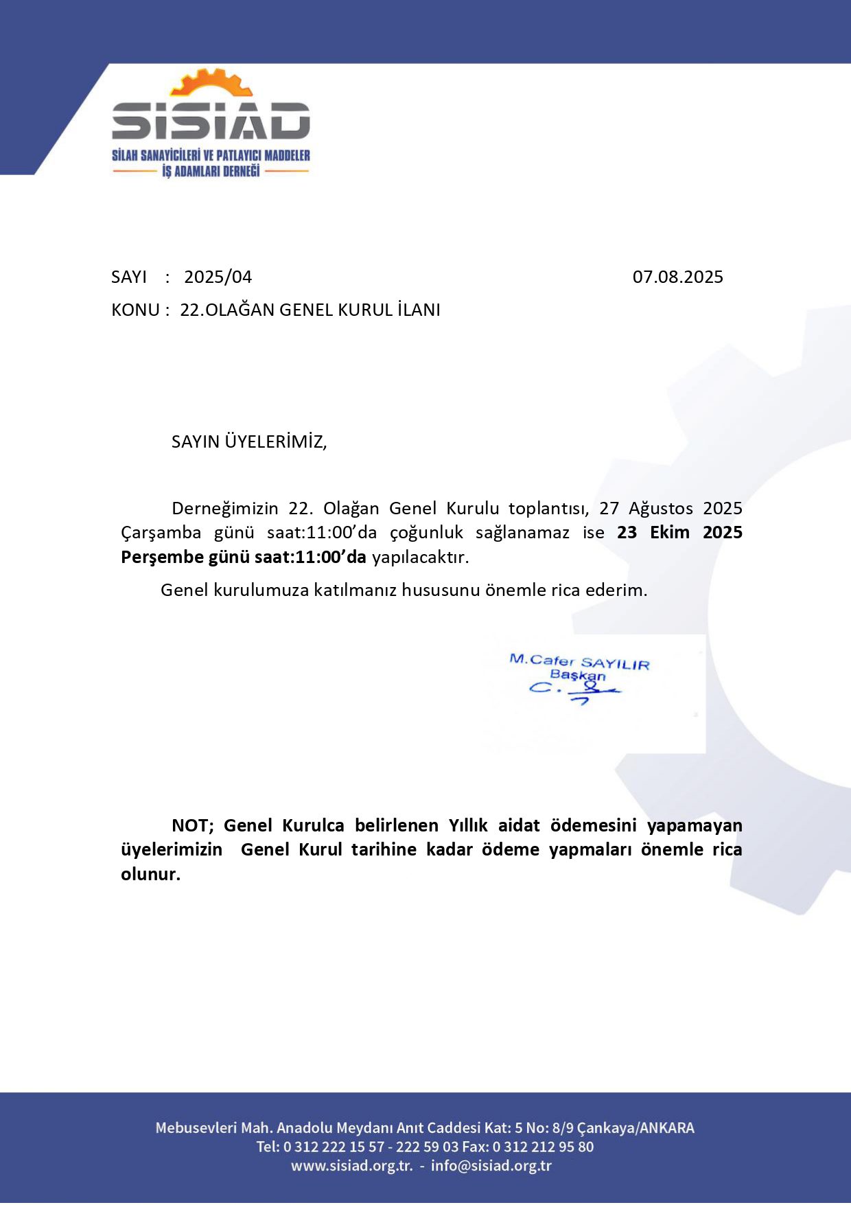 Derneğimizin 22. Olağan Genel Kurulu toplantısı, 27 Ağustos 2025 Çarşamba günü saat:11:00’da çoğunluk sağlanamaz ise 23 Ekim 2025 Perşembe günü saat:11:00’da yapılacaktır. Genel kurulumuza katılmanız hususunu önemle rica ederim.